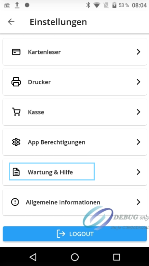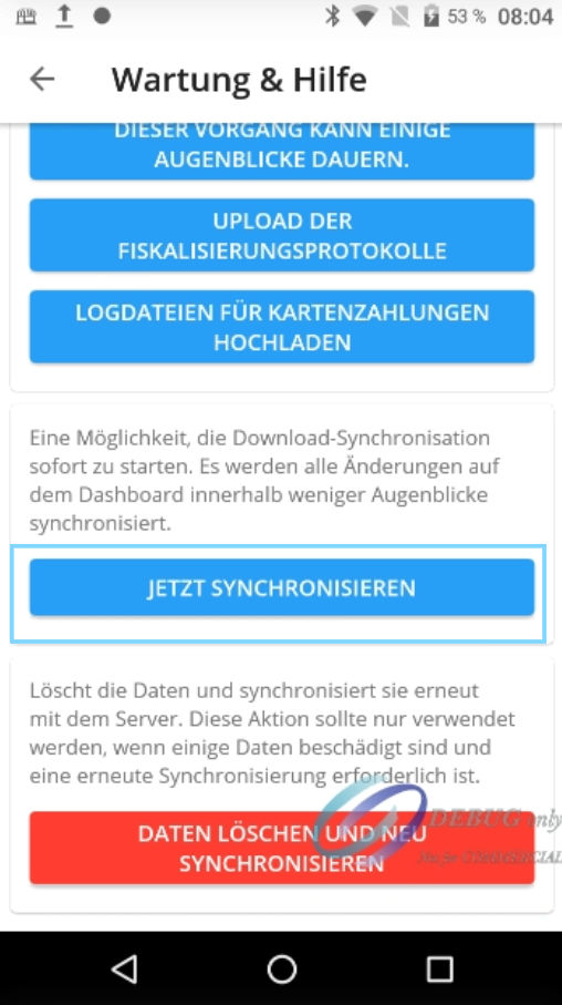 Unter „Wartung und Hilfe“ finden Sie im unteren Bereich den blauen Balken „Jetzt synchronisieren“. Mit dieser Funktion wird die Kasse aktualisiert. Wenn im Dashboard Änderungen vorgenommen wurden, die an der Kasse noch nicht sichtbar sind, können diese über das Synchronisieren übernommen werden.
